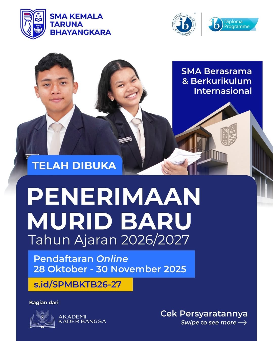 Proses seleksi penerimaan peserta didik baru (PPDB) untuk angkatan kedua SMA Kemala Taruna Bhayangkara (KTB) resmi dimulai. Kick off kegiatan ini digelar di Puldasis Gedung Rupatama Mabes Polri, Jakarta Selatan, pada Selasa, (28/10) lalu.