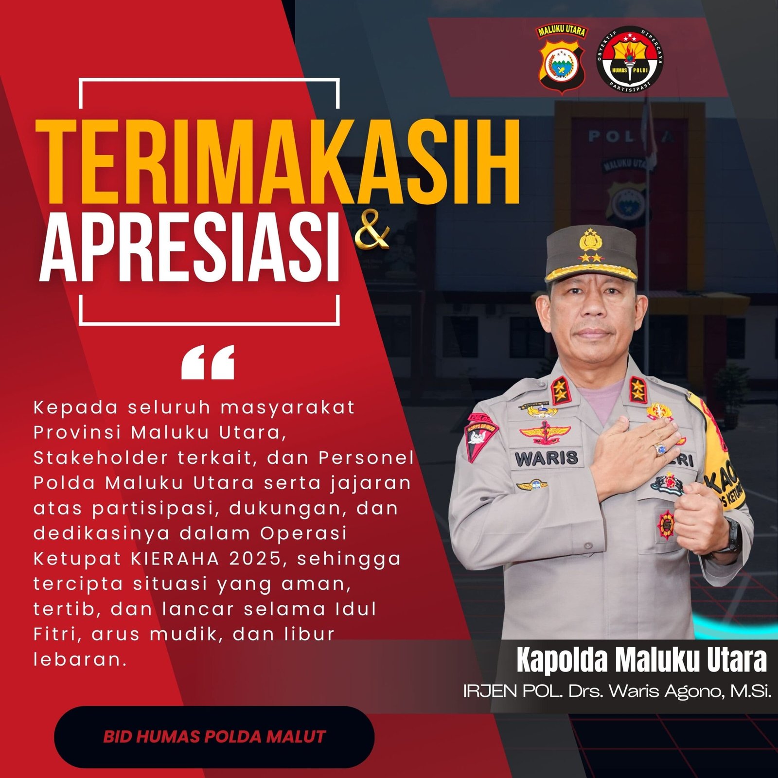Kepala Kepolisian Daerah Maluku Utara Irjen Pol. Drs. Waris Agono, M.Si mengucapkan terima kasih dan apresiasi yang setinggi-tingginya kepada seluruh pihak yang turut mendukung suksesnya pelaksanaan Operasi Ketupat Kieraha Polda Maluku Utara Tahun 2025 dalam rangka pengamanan perayaan Idul Fitri 1446 H sehingga situasi Kamtibmas tetap aman dan kondusif.
