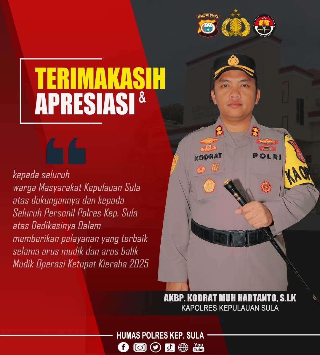Kepala Kepolisian Resor Sula AKBP Kodrat Muh Hartanto, S.I.K, mengucapkan terima kasih dan apresiasi yang setinggi-tingginya kepada seluruh pihak yang turut mendukung suksesnya pelaksanaan Operasi Ketupat Kieraha Polda Maluku Utara Tahun 2025 dalam rangka pengamanan perayaan Idul Fitri 1446 H sehingga situasi Kamtibmas tetap aman dan kondusif.