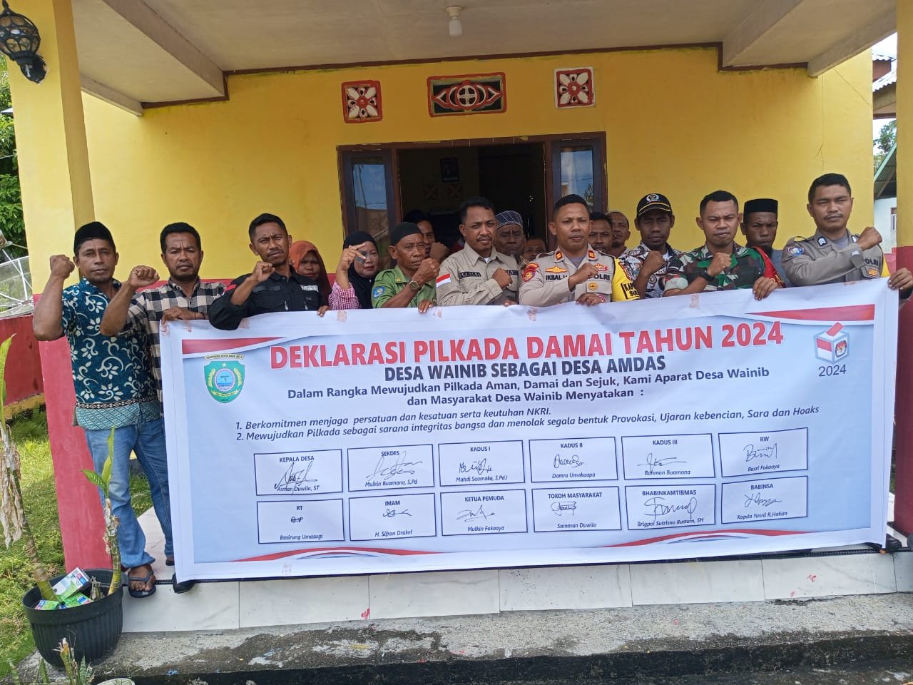Polres Kepulauan Sula- Kapolsek Sulabesi Barat Ikbal Umanailo, S.H, melaksanakan Kegiatan Deklarasi Damai untuk sukseskan Pilkada 2024 di Kabupaten Kepulauan Sula, yang berlangsung di Aula Kantor Desa Wainib pada Jumat (27/9/24).