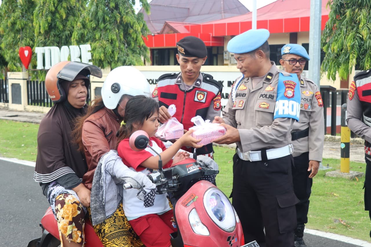 Sebanyak 100 paket takjil dibagikan kepada masyarakat yang melintas di depan Mako Polresta Tidore. Para pengendara tampak antusias menerima takjil yang diberikan sebagai bekal berbuka puasa di tengah perjalanan.