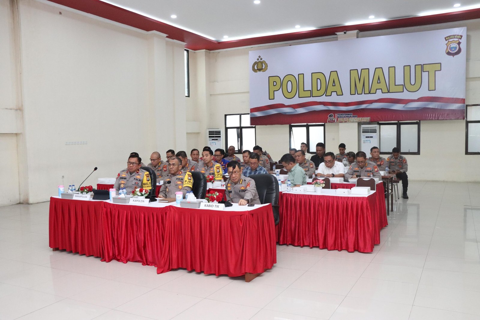 Turut hadir Wakapolda Malut Brigjen Pol. Stephen M. Napiun, S.I.K, S.H., M.Hum. beserta para pejabat utama Polda Maluku Utara.