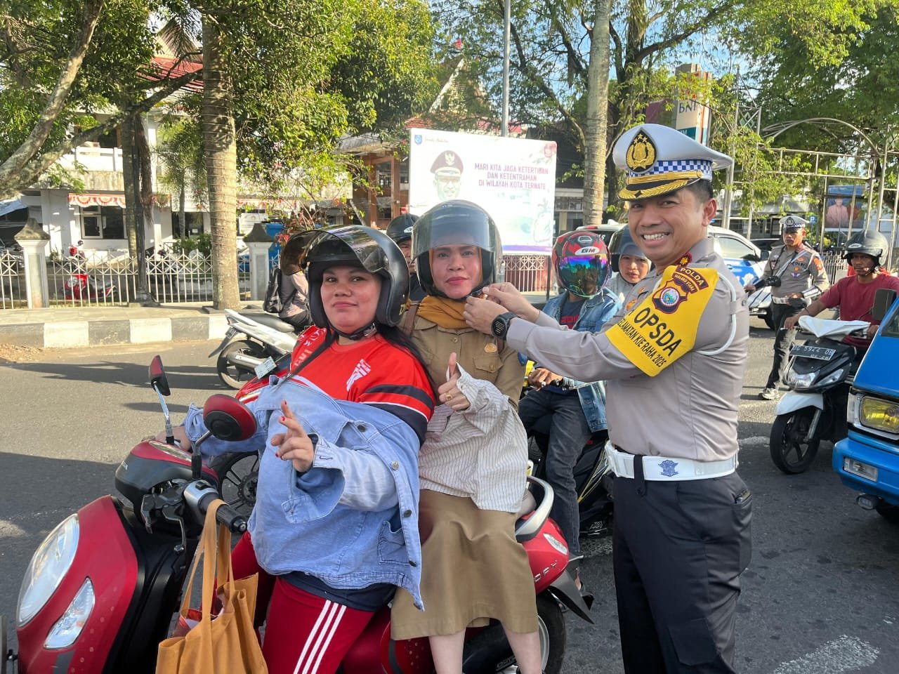 Dalam rangka meningkatkan kesadaran keselamatan berkendara, Ditlantas Polda Maluku Utara melaksanakan kegiatan bagi-bagi helm gratis serta edukasi penggunaan safety belt di lampu merah Kelurahan Kampung Pisang. Selasa (11/2)